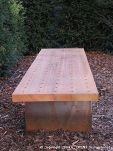 Bank ohne Lehne Stahlkonstruktion Corten Stahl, Fuß an Holzauflage geschraubt. Kambala Kantholzauflage, gelocht und geölt, oder lasiert in RAL Farben. Maße: Länge: 2000 mm, Breite: 500 mm, Sitzhöhe 500 mm Fundament: 40x40x40 cm aus B 15 Einbauanleitung (PDF)